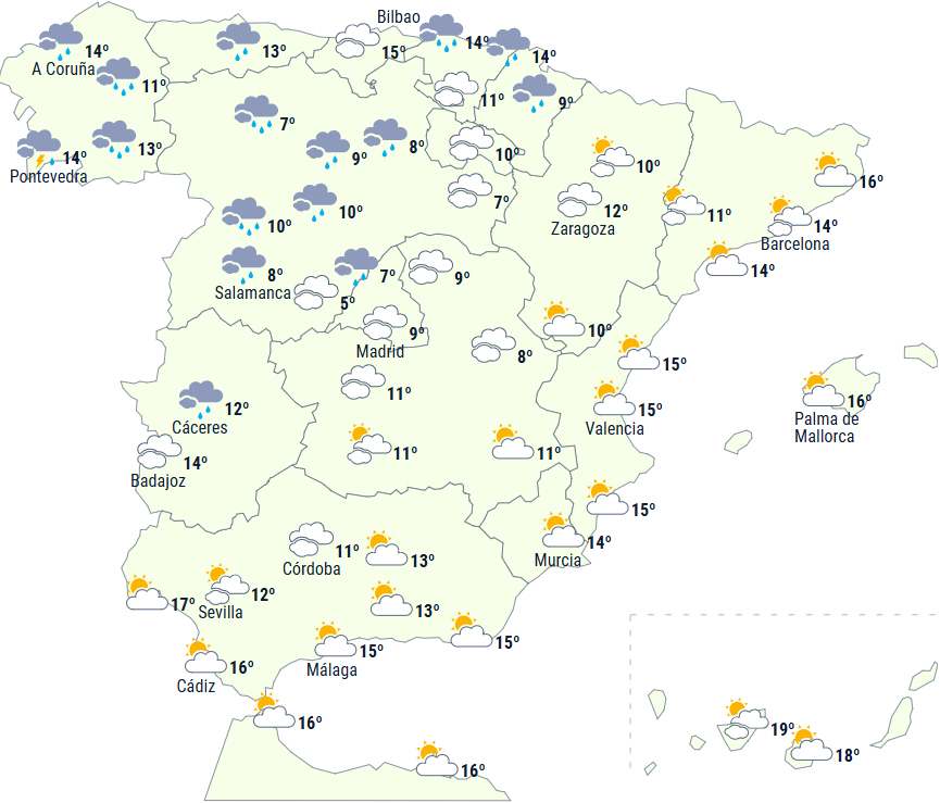 I dag vil en koldfront trække ind vest for halvøen og give skyet eller overskyet himmel med nedbør i det meste af landet. Disse forventes at være tungere i den nordvestlige del og kan blive vedvarende vest for de centrale bjerge og især i Galicien.