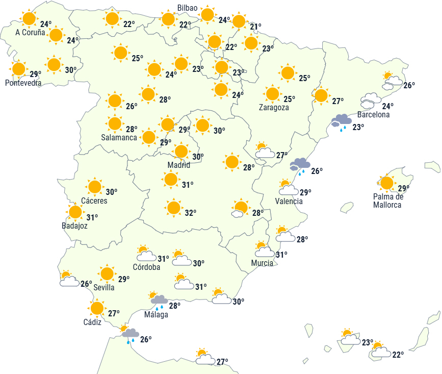 Dagstemperaturerne vil let falde langs middelhavskysten og på øgrupperne, mere markant på det sydvestlige Den Iberiske Halvø, mens de stiger i resten af landet.