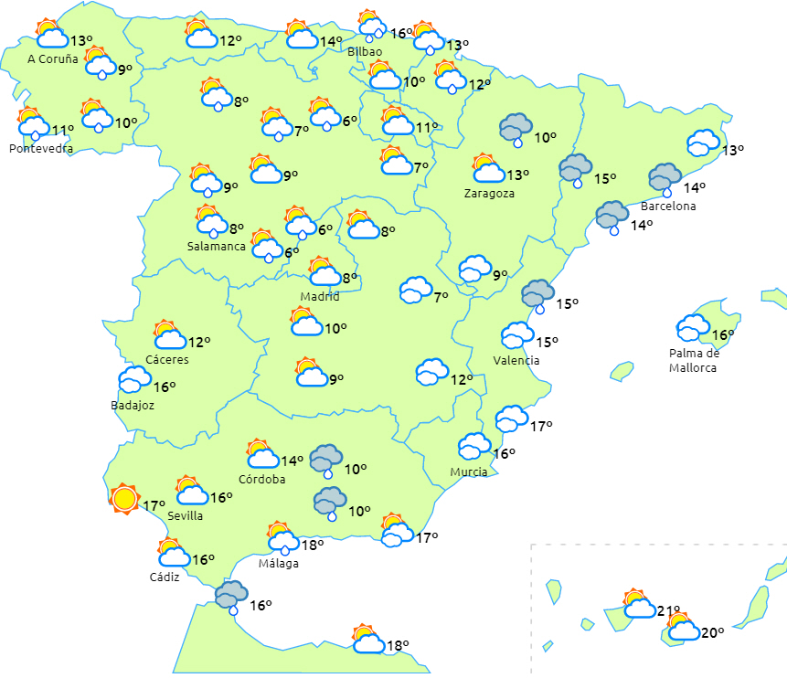 På halvøen vil en Atlanterhavsfront, som begyndte at trænge ind i løbet af i går, fortsat brede sig fra vest til øst med overskyet vejr og svag nedbør til den nordlige og vestlige halvdel af halvøen. Det vil være kraftigere og mere vedvarende i den vestlige del af Galicien og i bjergområderne, men det har tendens til at aftage i løbet af anden halvdel af dagen.