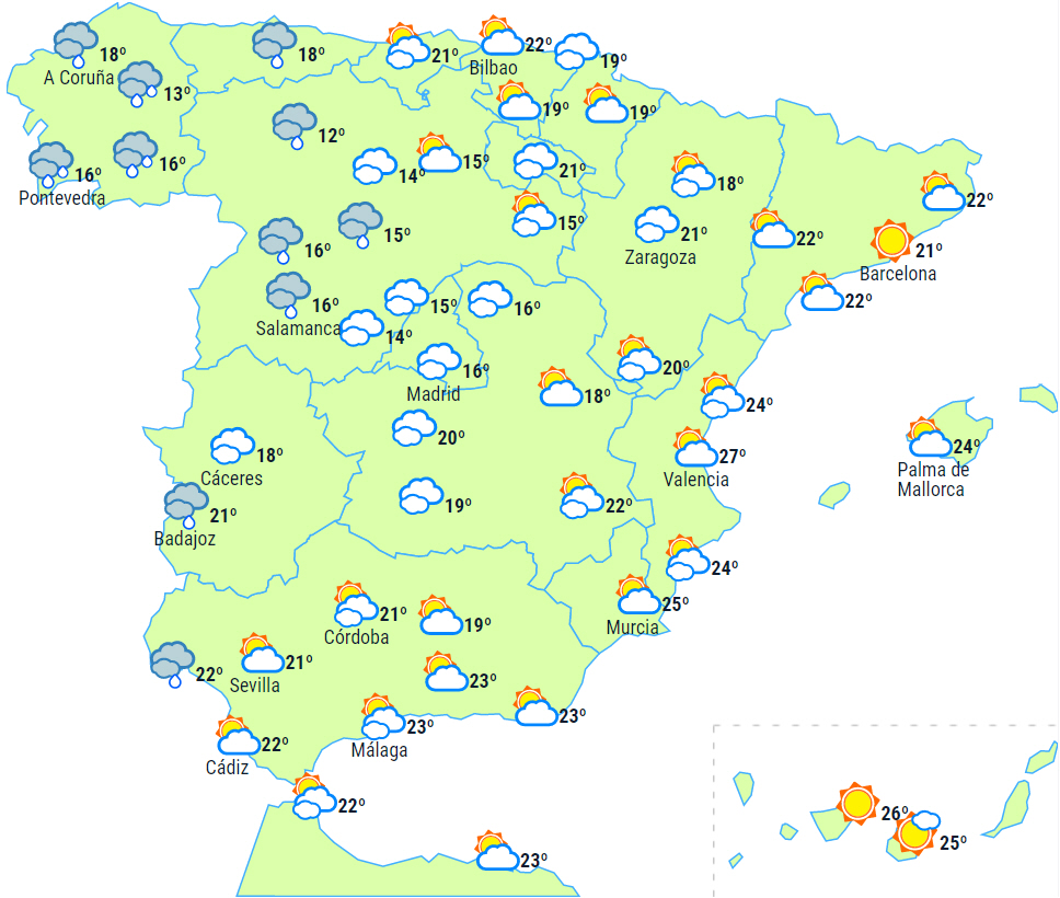 Lavtliggende skyer, tåge og muligvis morgendis i bjergene på den nordvestlige del af halvøen, den nedre Ebro-dal, dele af Middelhavsområdet og det vestlige Andalusien.