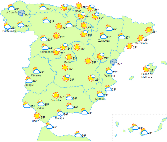 På resten af halvøen og De Baleariske Øer letskyet, dog peridoer med lavthængende skyer og sandsynlighed for morgentågebanker i Middelhavsområdet og i området ved Strædet og Alboran.