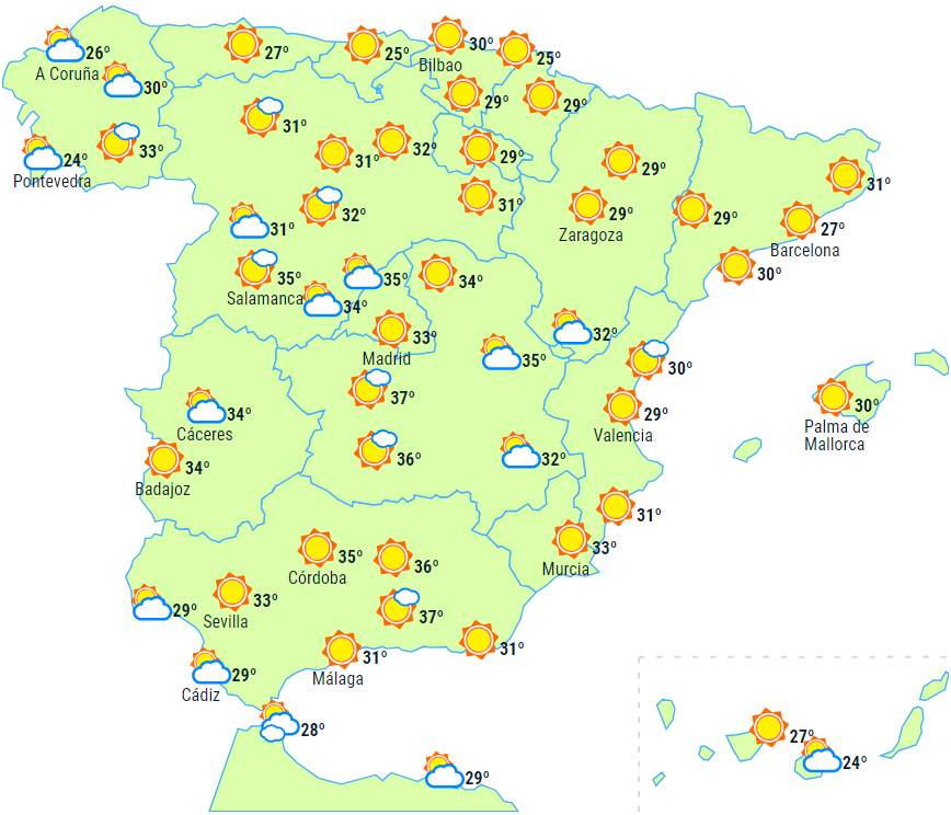 Temperaturerne vil fortsat være meget høje, og generelt en del over de normale niveauer for årstiden. Dagstemperaturerne vil stige på en stor del af halvøen og øgrupperne og endda nå bemærkelsesværdige stigninger i områderne ved Det Cantabriske Hav og den øvre Ebro-dal. De falder til gengæld lidt i den vestlige del af Galicien, Extremadura og Andalusien.