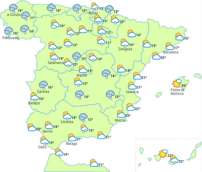 Dagstemperaturerne stiger i dalene Huesca og Lérida og let på den sydlige tredjedel af halvøen - mest markant ved kysterne. Det bliver til gengæld lidt køligere i resten af den nordlige halvdel og ellers uændret i resten. Nattemperaturerne stiger på den sydøstlige del af halvøen og i de nordøstlige dale, er uændrede på begge øgrupper og falder på resten af halvøen - særligt mærkbart fald i de centrale områder af halvøen. Svag frost i bjergområderne på den nordlige halvdel - mere intens i Pyrenæerne.
