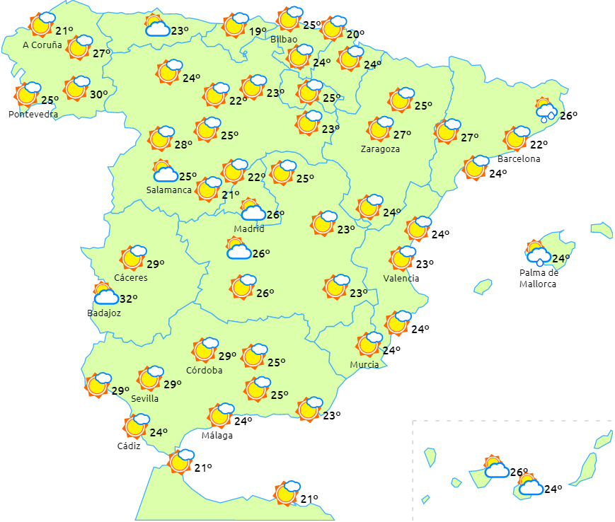 Overvejende letskyet eller klart vejr i hele landet med enkelte højtliggende skyer over den vestlige halvdel af halvøen. Der forventes kun nogle få lavthængende skyer om morgenen over det nordlige område samt lidt overskyet om eftermiddagen over Mallorca, den sydlige og østlige del af halvøen, i de centrale bjerge og over den nordvestlige del af Castilla y León.