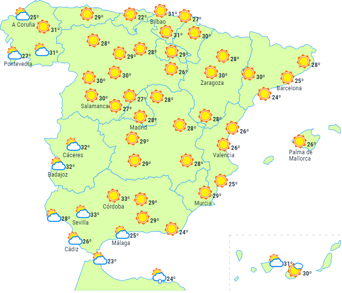 På det meste af halvøen og De Baleariske Øer vil der fortsat være stabilt vejr med letskyet eller klar himmel. Der forventes kun nogle lavthængende morgenskyer ved Galiciens kyster og Det Cantabriske Hav, Middelhavsområdet og det indre af den sydøstlige del af halvøen med mulighed for lokal morgentåge og måske lidt svag og spredt regn i områderne ved Gibraltarstrædet.
