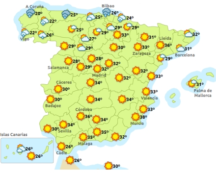 Det fine sommervejr fortsætter langs de spanske Middelhavskyster. Bortset fra et kortvarigt hedevarsel for Sydspanien søndag med svedige 36 grader, så vil de højeste dagtemperaturer komme til at ligge på omkring de 30 grader.