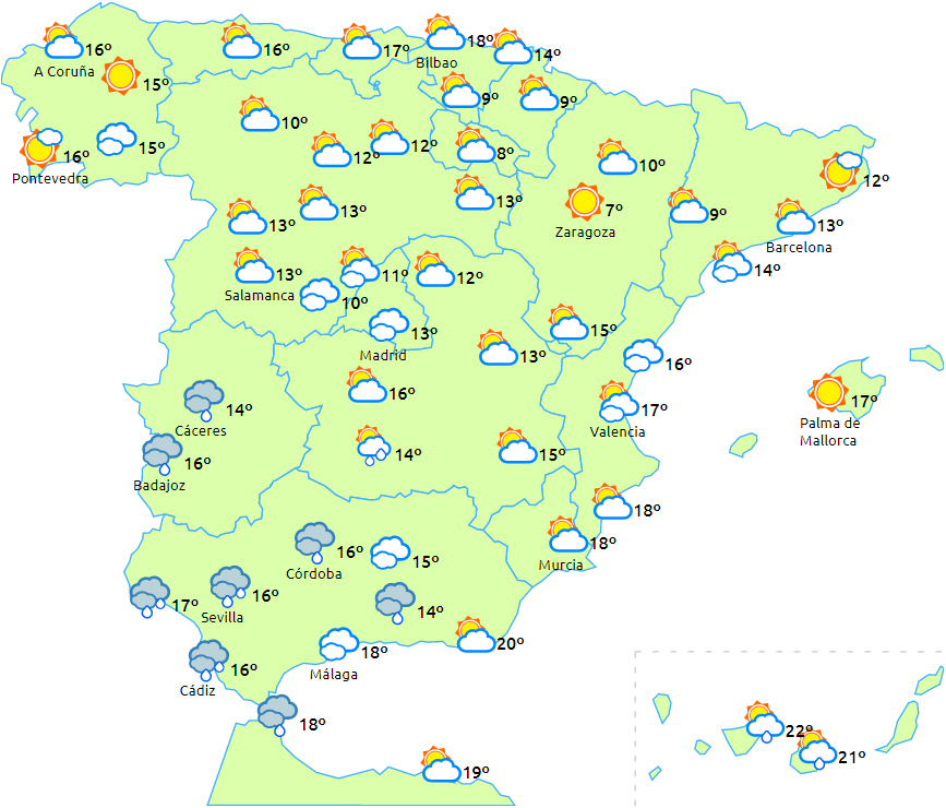 Temperaturerne har tendens til at stige på det meste af halvøen og ligger fortsat klart over normalen, undtagen i den nordøstlige tredjedel. Der forventes kun frost i Pyrenæerne. Kun små ændringer på øgrupperne.
