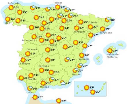 Hele landet har i dag mest solrigt med undtagelse af Pyrenærerne og De Kanariske Øer, som får mere skyet vejr.