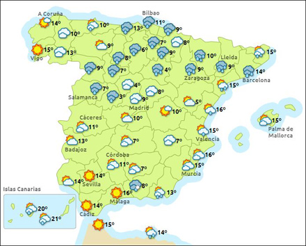 Vinteren har holdt sit indtog i Spanien, og det er blevet koldt, blæsende og vådt i hele landet. I de nordøstlige egne kuling og i de østlige egne kraftig nedbør. Det våde og kolde vintervejr fortsætter ind i næste uge, og temperaturerne falder yderligere.