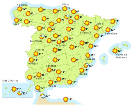 Vejret bliver stadig vinterkoldt, men knapt så blæsende og vådt som i forrige uge. Den forlængede helligdagsweekend er en oplagt mulighed for at tage en tur op i sneen. I Sierra Nevada skinner solen, og der er 14 km pister at boltre sig i. Men nyd det, for midt på ugen bliver det mere ustadigt og skyet.