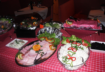 Til forret er der salat med diverse røget fisk, cognac gravet lask med dild sauce, tarteletter med ostegratineret høns i asparges, reje cocktail eller friturestegt camembert.