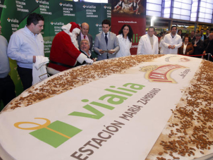 Kagen er lavet af den kendte julekagefabrik Mantecados La Muralla i Estepa i Sevilla-provinsen og vejer 300 kilo. Gigantkagen blev præsenteret i et indkøbscenter i Málaga i går og blev skåret ud i 10.000 portioner på hver 30 gram, der blev uddelt til kunder i centeret.