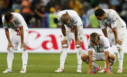 Porgugiserne med dukkede hoveder efter Spaniens afgørende scoring