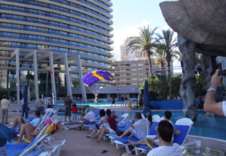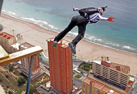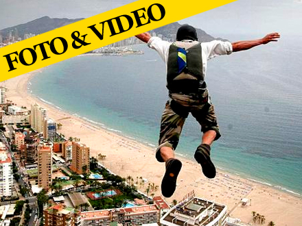 Luftens vildeste vovehalse kastede sig lørdag morgen ud fra det 200 meter høje boligkompleks "In Tempo", der ligger i den østspanske turistby Benidorm.