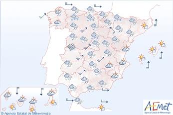 Værst ramt vil være de nordligste egne og dele af Midt- og Sydvestspanien. I de østlige og sydøstlige egne skyet og nogen nedbør.