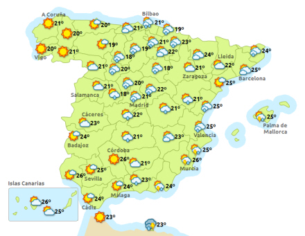 Madrid har haft en skyet start på dagen, men senere i dag kigger solen frem af og til og sørger for temperaturer på mellem 13 24 grader.