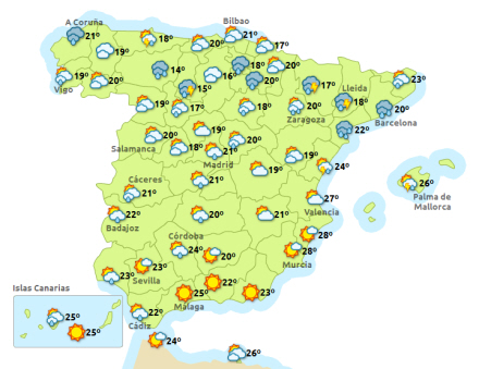 Málaga kan præsentere temperaturer på mellem 19 og 30 grader, og der vil også være risiko for regn og torden i løbet af dagen. Risikoen er størst først på dagen.