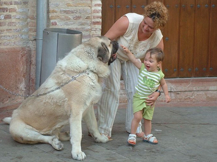 Lille dreng hilser på kæmpehund, der venter på at komme til konkurrencen