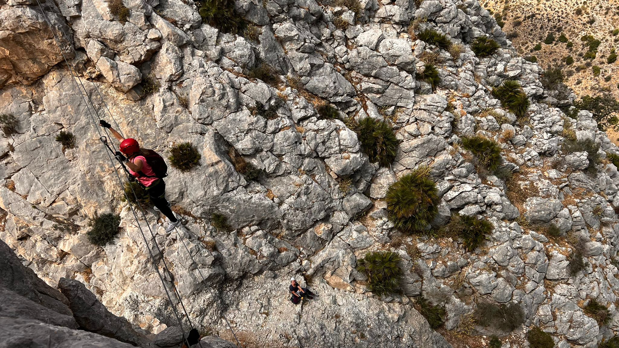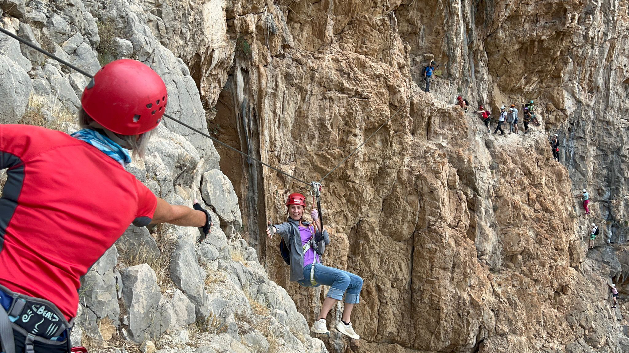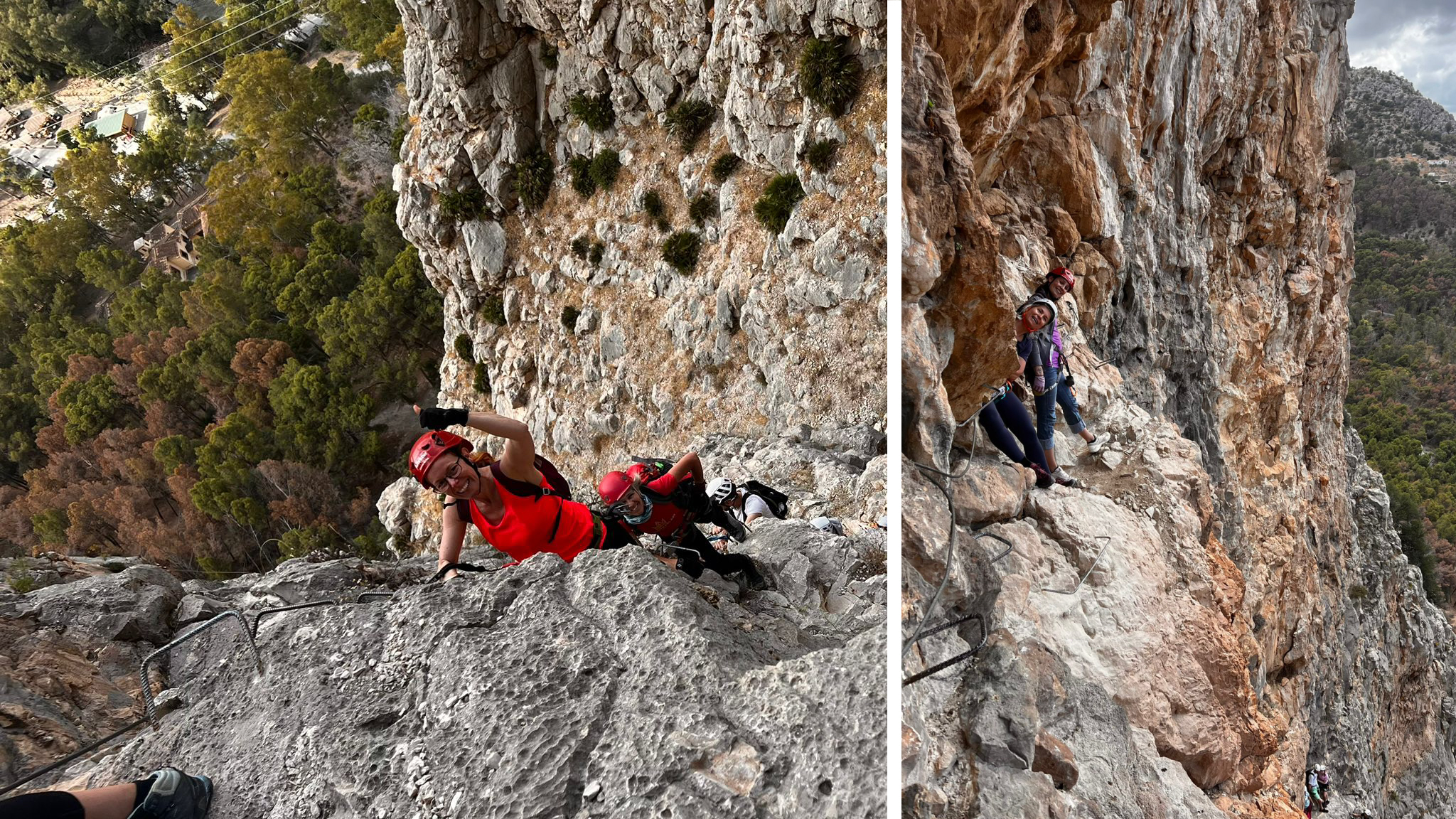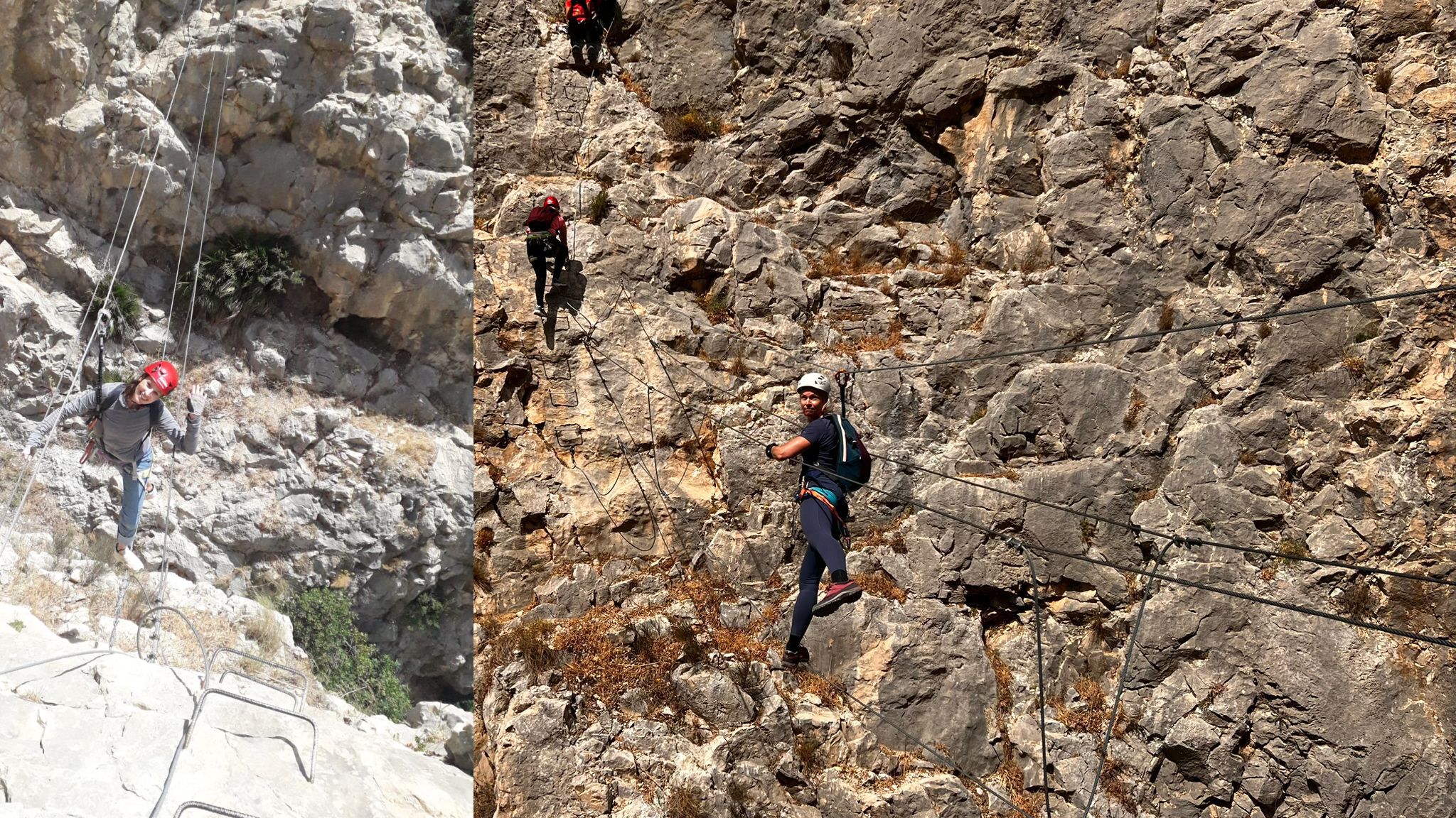 Turen startede lige på og hårdt med at kravle lodret op en helt masse meter. Først lavede vi dog en lille test af “formen”, hvor vi én efter én kravlede af sted. På det første metaltrin skulle vi klikke os os fast med karabinhagen på trinnet i hoftehøjde, “stole på udstyret” og give slip med begge hænder.