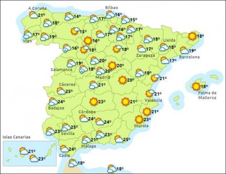 Madrid får i dag tiltagende skydække med 11 – 25 grader, Barcelona letskyet og 13 – 20 grader, Valencia ret solrigt med mellem 15 – 22 grader og Málaga også ret solrigt med 18 – 25 grader.