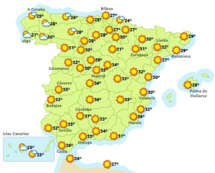 Madrid får 19 - 36 grader. og i Barcelona bliver 21 - 29 grader. Valencia får det en tand varmere med 22 – 32 grader, og i Málaga bliver temperaturen på 23 – 33 grader.