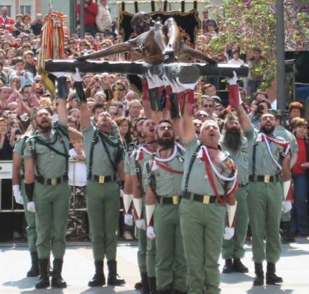 Legionærerne bærer korset med den korsfæstede Jesus fra broderskabet 'Mena' torsdag formiddag inden optoget samme aften