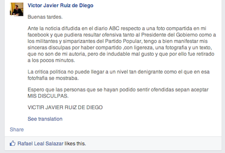 Siden kom Ruiz under hård kritik fra blandt andet PP, der krævede en officiel undskyldning, og sent tirsdag aften slettede opslaget igen og undskyldte: