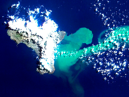 Der blev i går taget billeder fra observations-satellitten Deimos-1. For to år siden blev den sendt ud i rummet af det spanske selskab Elecnor. Billederne afslører, at den grønne plet på havoverfladen, der er opstået efter vulkanudbruddet under vandet, nu rent faktisk er større end selve øen, El Hierro.