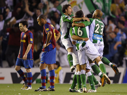 Her er det Real Betis der fejrer en scoring mod F.C. Barcelona