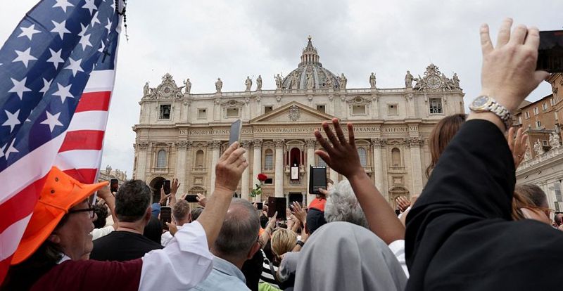 Fra samme centrale balkon på Peterskirken, hvor han præsenterede sig for verden som Leo XIV, viste paven sig klokken 12 til sin første officielle offentlige handling efter messen i Det Sixtinske Kapel fredagen før og mødet med kardinalkollegiet lørdag.
