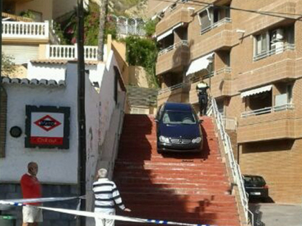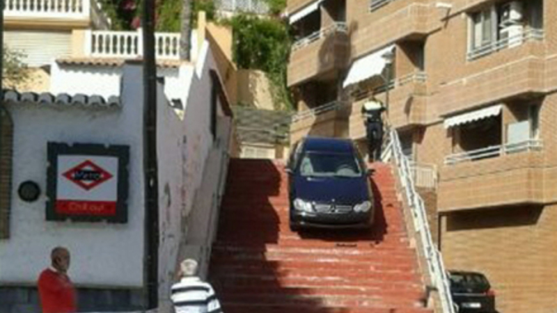 Ikke alle er lige gode til at parkere, og der er mange måder at stille bilen på, men denne er alligevel nok en af de mere usædvanlige. Forbipasserende spærrede øjnene godt op, da de i går fik øje på en bil, der holdt parkeret på en trappe i Pedregalejo i det østlige Málaga.