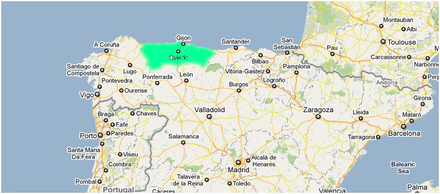 Asturien – på spansk Asturias – ligger i den nordligste del af Spanien (markeret med tyrkis farve på kortet).