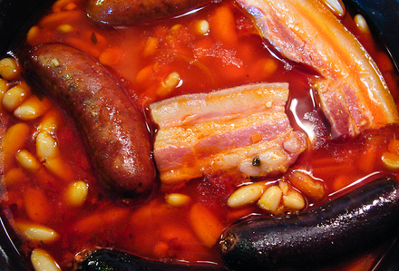 Hovedingredienserne i Fabada er bønner, chorizo, blodpølse, flæsk, løg, bouillon og kryderier. Er du ikke til blodpølse, så glem den! Du kan Google 'receta fabada' for at få hundredvis af forskellige opskrifter og samtidig øve dig på lidt spansk...