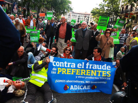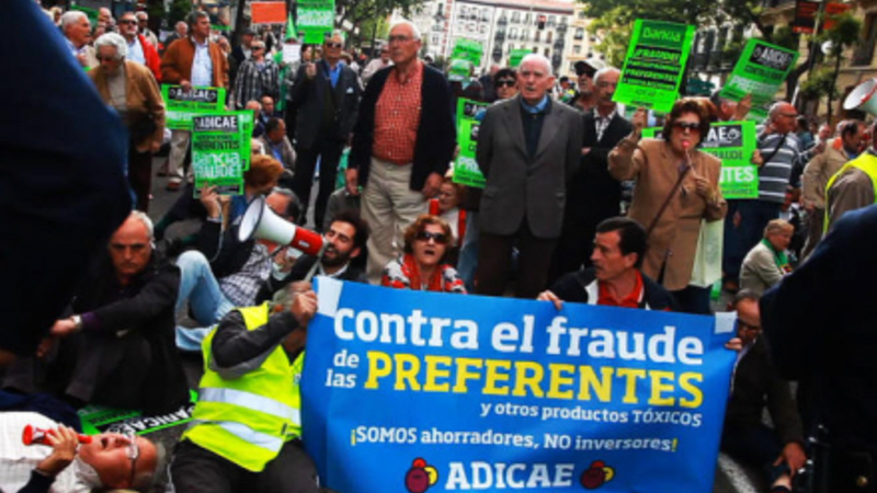 Caja Madrid er nu en del af den nationaliserede storbank Bankia. Den er anklaget for at have solgt præference-aktier forklædt som risikofrie opsparings-ordninger. Da banken krakkede blev aktierne erklæret værdiløse og blev opkøbt af den spanske stat.
