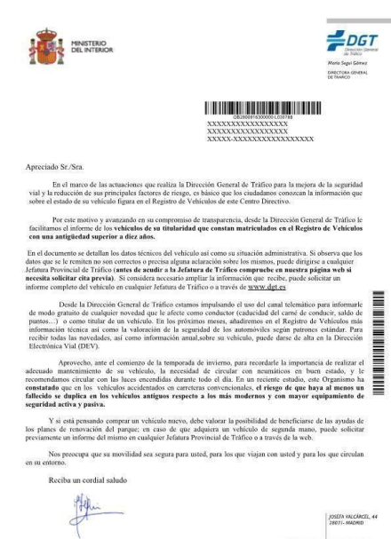 I brevet, der sendes med post fra La Dirección General de Tráfico (DGT), er der vedlagt oplysninger om bilen, og du bliver bedt om at tjekke, at de er korrekte. I modsat fald skal oplysningerne korrigeres.