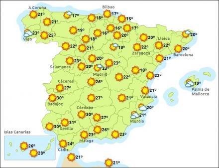 Madrid har i dag lidt diset vejr med mellem 11 - 26 grader, Barcelona letskyet og 14 – 20 grader, Valencia solrigt med mellem 15 – 23, og Málaga har letskyet vejr og mellem 17 – 25 grader.