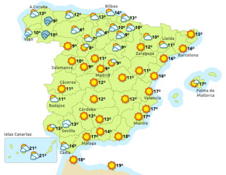 Årstiden til trods så stiger dagstemperaturerne i den nordlige del af fastlandet helt ned til det sydlige Aragón, mens den falder i andre områder af den vestlige del af halvøen. Til gengæld er nattemperaturerne på vej i den anden retning. Få ændringer i resten af landet.