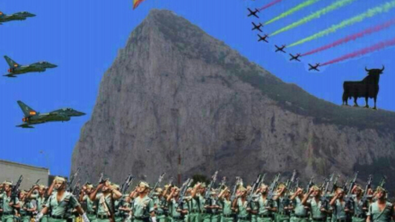 Billedet er stykket sammen af forskellige lånte elementer, men viser den spanske legion marchere foran den berømte klippe i Gibraltar, hvor der på toppen er hejst et spansk flag.