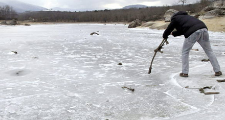 En mand forsøger at bryde den tykke is, der dækker marsken Pontón Alto, der forsyner byen Segovia