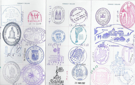 Inden afrejsen til pilgrimsruten anskaffer man sig et pilgrimspas. Det er et lille hæfte med plads til stempler fra kirker, herberger, cafeer og restauranter på ruten, der alle har et stempel med deres navn på.