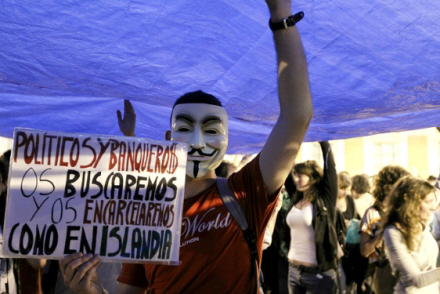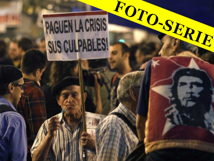 Demonstranterne protesterer mod den økonomiske og politiske krise, der har ramt landet. Blandt deltagerne var flere medlemmer af folkebevægelsen 'Reelt demokrati nu', som søndag også stod bag flere omfattende demonstrationer i 50 spanske storbyer. Søndagens demonstrationer endte med vold og masseanholdelser. Læs mere om det her.