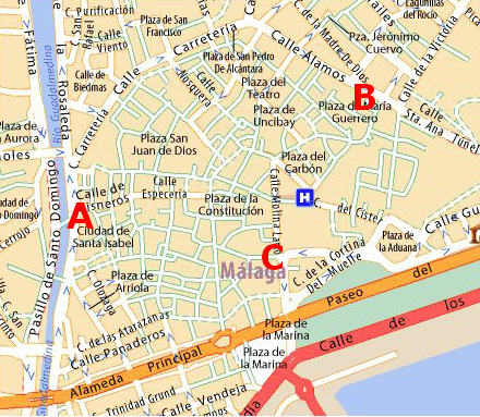 A: Museo de Artes y Costumbres Populares, B: Museo del Vidrio y Cristal de Málaga og C: Museo Casa de Muñecas.