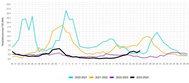 Indlæggelsesfrekvensen for coronavirus i den sidste uge er steget fra 3,5 til 4,5 pr. 100.000 indbyggere og er fortsat højere end i pandemiens andet år på dette tidspunkt i juni 2021, da pandemiens anden sommer begyndte, og 48,9 procent af den spanske befolkning havde mindst en dosis af en vaccine mod covid, og 30,4 procent havde endda fået to stik. Den nuværende indlæggelsesrate er også højere end sidste år, hvor 85 procent af den samlede befolkning allerede var vaccineret.