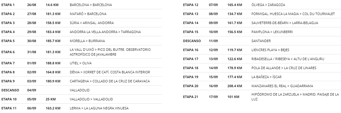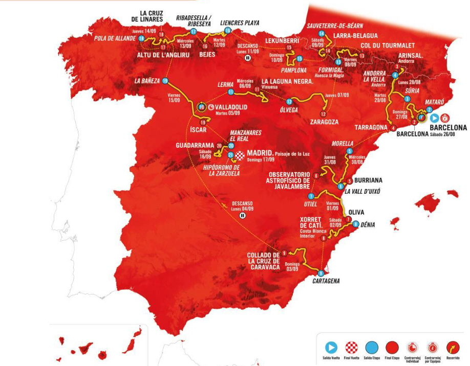 Vueltaen starter den 26. august i Barcelona og slutter den 17. i Madrid: