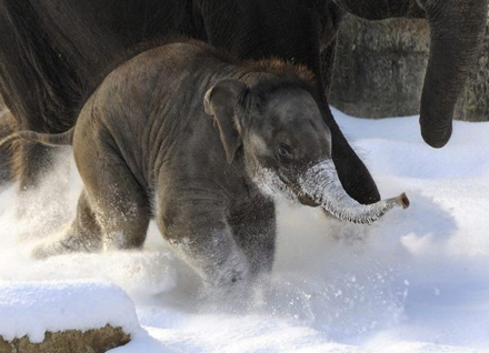 En lille elefantunge leger i sneen. Sneen på snablen afslører, at den har været på eventyr