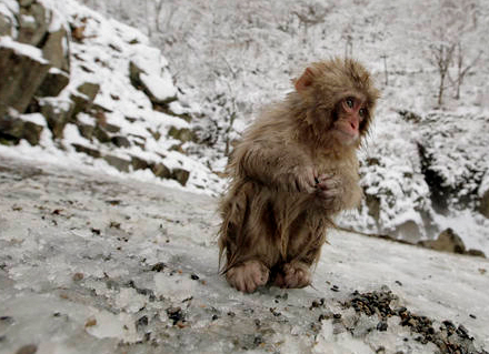 En nuttet lille japansk macaque sidder i sneen i bjergene i den japanske by Yamanouchi