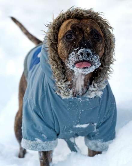 Denne unge dame hedder Tia. Hun er en 4-årig terrier, der er klædt på til kulden i Storbritannien
