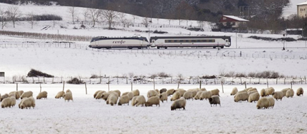 Et tog bevæger sig langs en sneklædt eng i Orduña, hvor en flok får græsser, så godt de nu kan