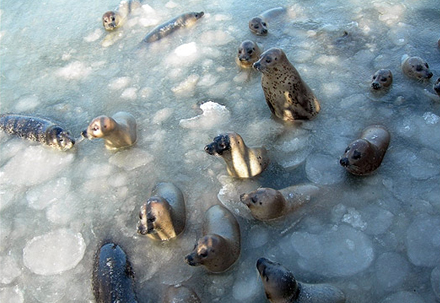 Denne flok nysgerrige sæler i naturreservatet Yantai, Kina, forsøger at bevæge sig så godt de kan, efter at de nærmest har været fanget i isen