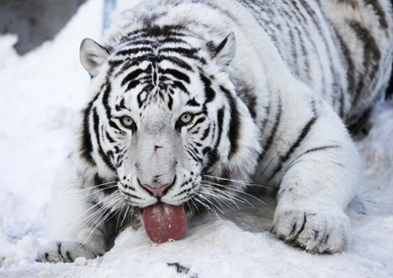 Khan, en hvid Bengalsk tigerunge, smager forsigtigt på sneen i Ruchey Royev Zoo, i den sibiriske by Krasnoyarsk, Rusland, som i disse dage har nået en temperatur på -35 grader